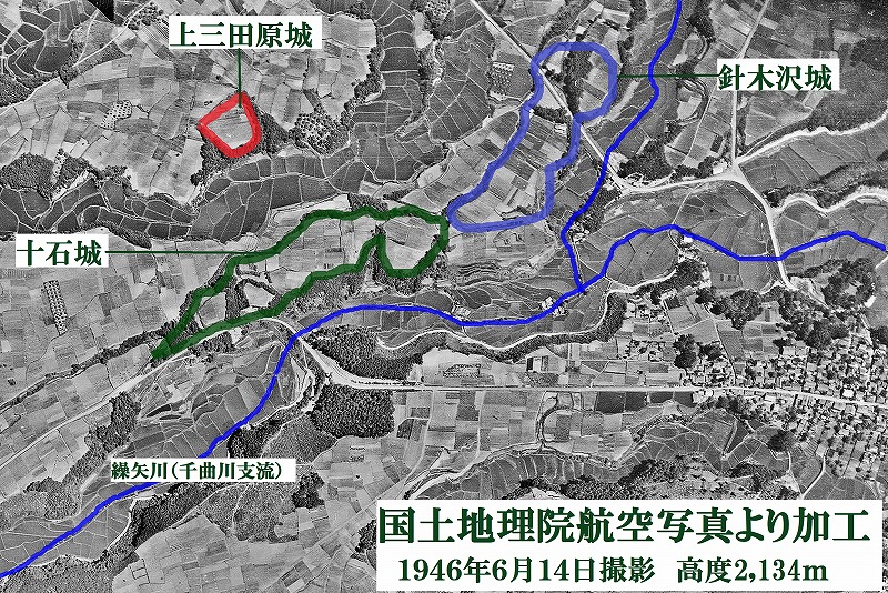 先月28日に訪れた小諸市南東部の十石城付近の航空写真を編集加工してみた この手法が有用なのは比較的平坦な丘陵地帯と平野部であり、山岳地帯と戦前からの既成市街地方面については余り役立つことは無いようだ 元データは国都地理院で USA撮影番号M165-A-6、 撮影高度2,143m、1946年6月14日撮影のもの