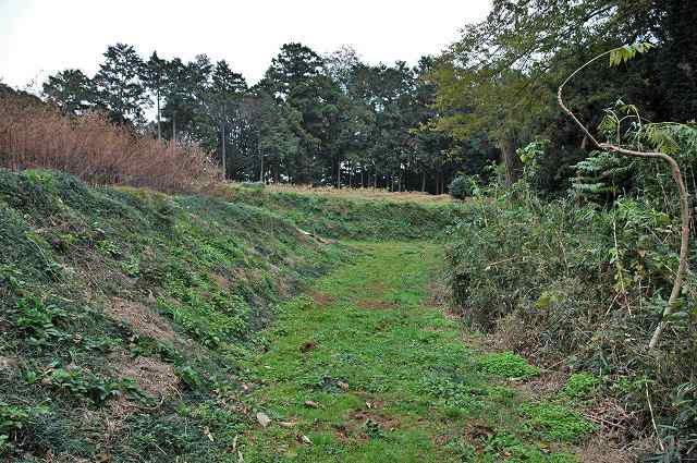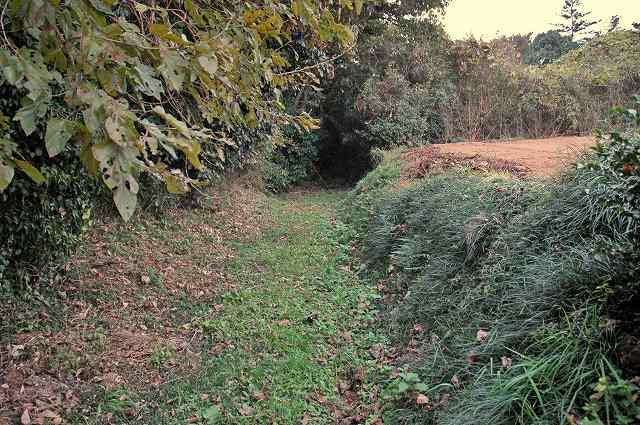 堀跡状の溝の深さは畑側でおよそ2m強、山林側で1m弱というところですが..余りに見事すぎていることや年代の古さを感じさせないような印象もあるので何とも判断しかねています。