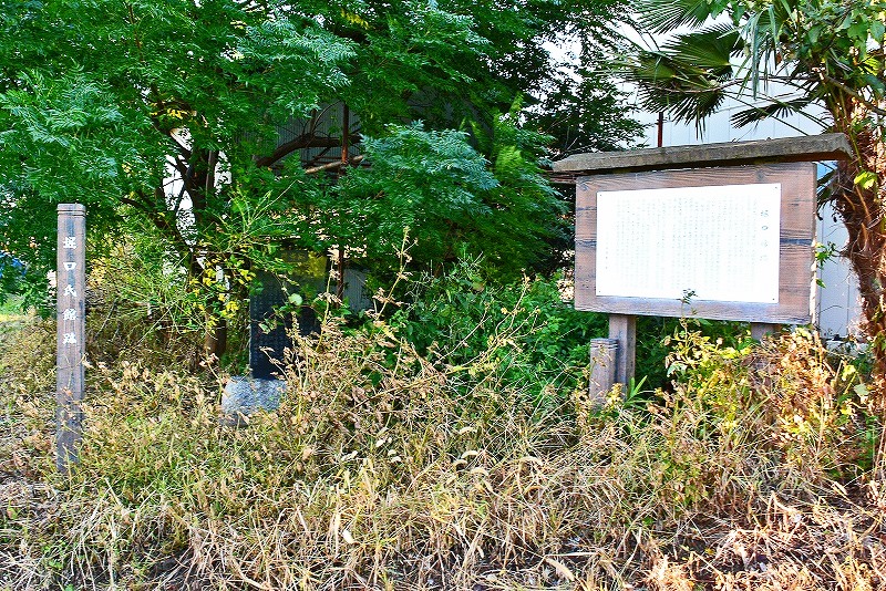 利根川支流早川堤防上に建設された県道276号線北東側の堤防下にいくぶん夏草に隠れがちではあったが城館跡の標柱と解説版が所在していた