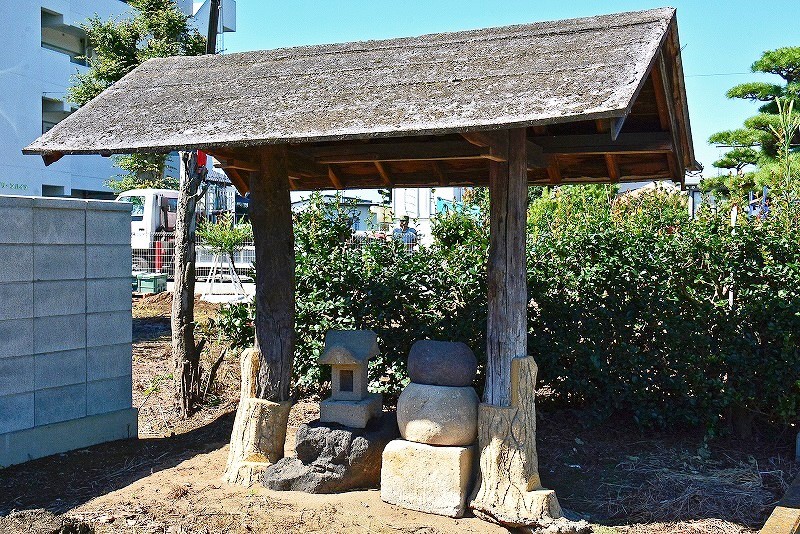 中江田本郷会館の斜向かい、住宅脇に天保期の稲荷社?の祠とともに下3段分の五輪塔が鎮座