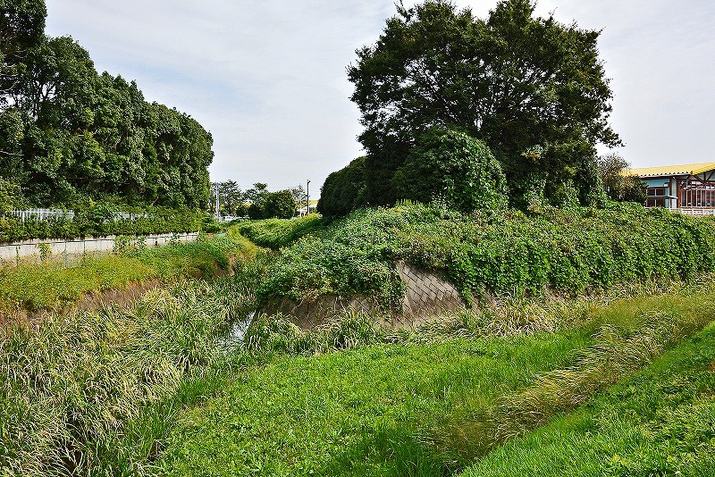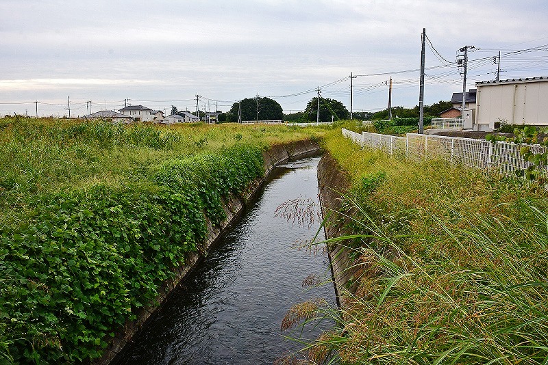 水路を挟んだ西側の方は概ね宅地化され一部畑が残り東には曲折した細道がある