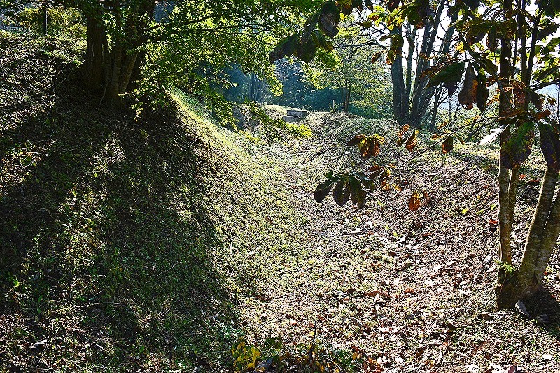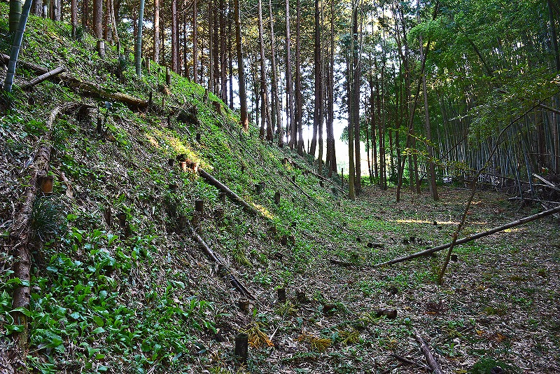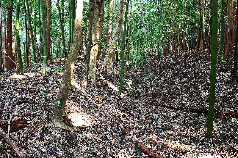 最初は藪に閉口しますが、横堀が目に入る辺りから藪が途切れ横堀とこれを取り巻く