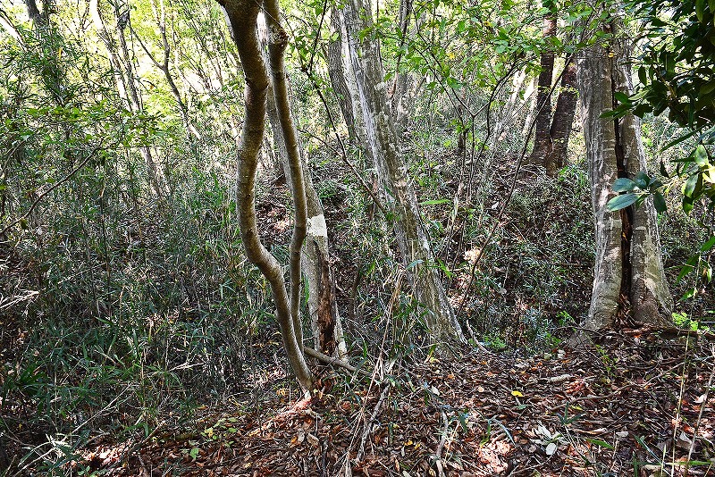 戻る途中で、藪に覆われた斜面には踏み跡ともいえないような草木を避けたような気配を発見。