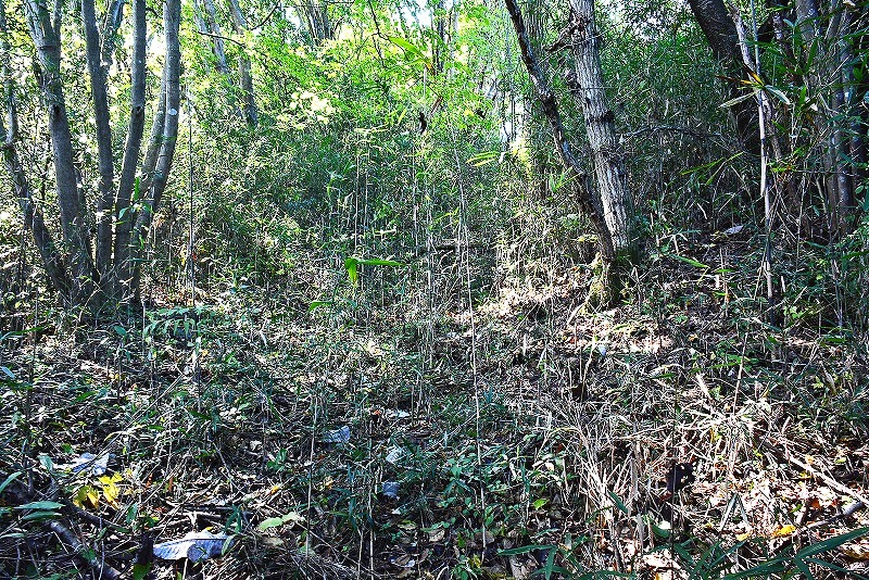 主郭とも考えられる平坦地は全体として西側に緩い傾斜があり、土塁のような盛り上がりも見えるのですけれども、何分にも藪が視界を遮りよく見えませんでした。