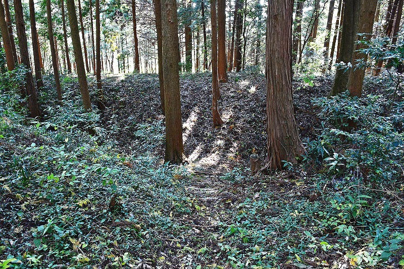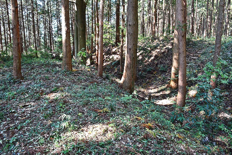 西に接している山根城との間には二重ないし三重の横堀がありますが、南端の方から回り込むとあまり横堀を横断せずに1度のみのアップダウンで進むことができます。