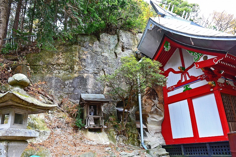 社殿は地山に所在している岸壁を削りそこに食い込むように建立されている。