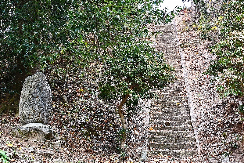 鳥居の先に北西方向に長く伸びた緩やかな参道の石段を上がっていくが、石段が北へと方向を変える個所はやや急な勾配となっている。