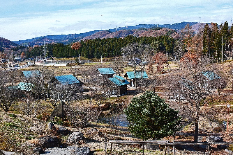 小高い丘陵上にある道の駅からは南東方向から城跡の遠景を一望することができる。