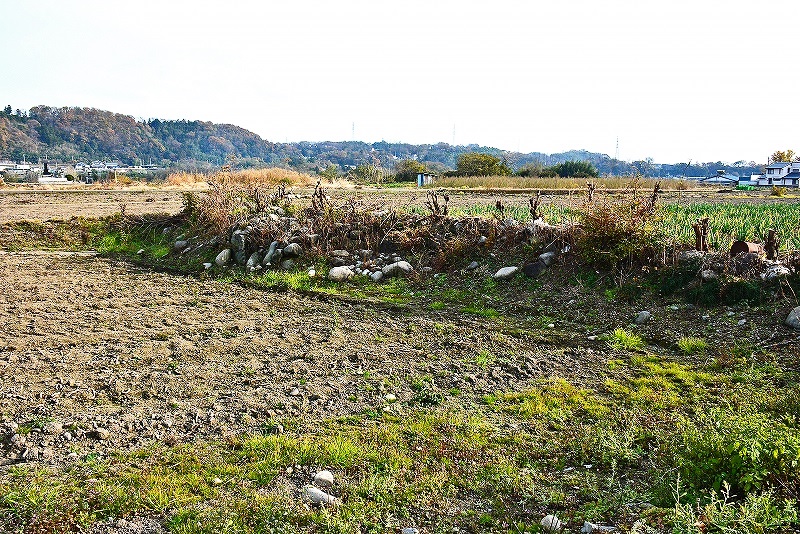 この一帯は畑地中に大きな石が混じる土質(たぶん吾妻川あるいは利根川の氾濫などに起因した川原石)なのだが、石塁であるかどうかは別として延長にして約25mほどの長さにわたり1m未満ではあるが明確な段差が残されている。