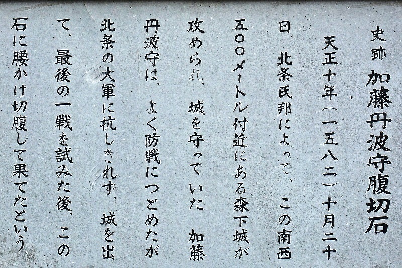 天正10年10月、森下城主加藤丹波守(真田方)が後北条氏の軍勢に敗れて切腹を遂げたとされる史跡であるり道すがらに立寄ってみた。