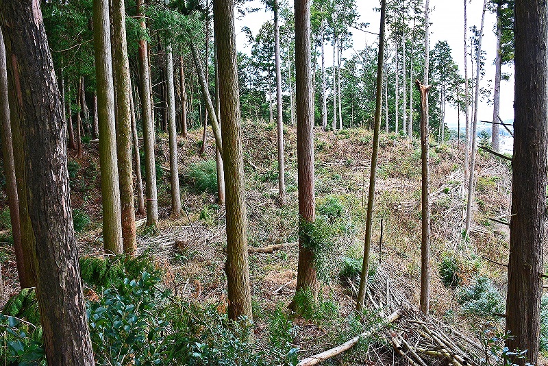 分岐した林道はそのまま北側の集落に降りてしまうので、進行方向左側に見える踏み跡を這い上がると「画像3」の主郭部の虎口状の地形へと辿り着く。