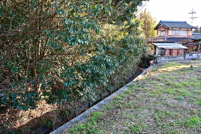 3.この水路(堀跡)の左側 4.JR草津線沿いに所在