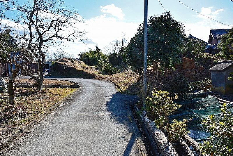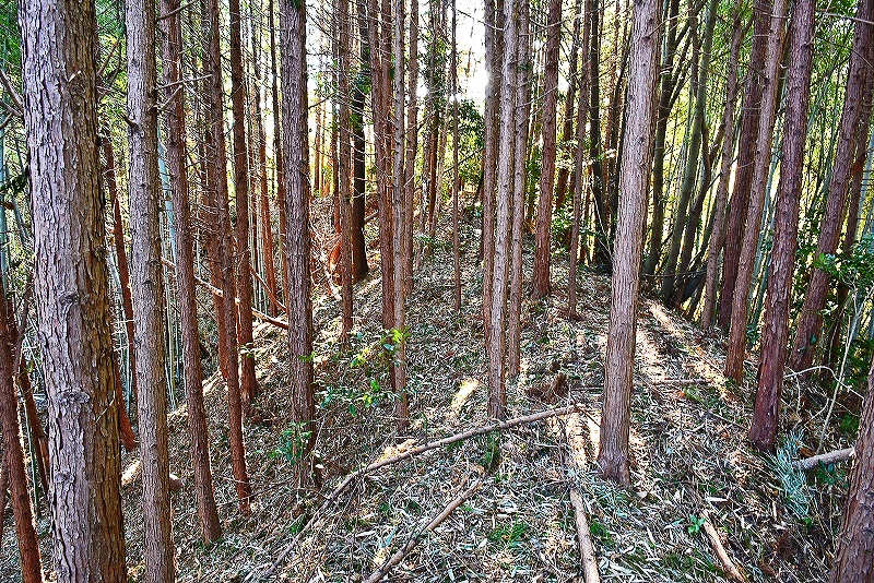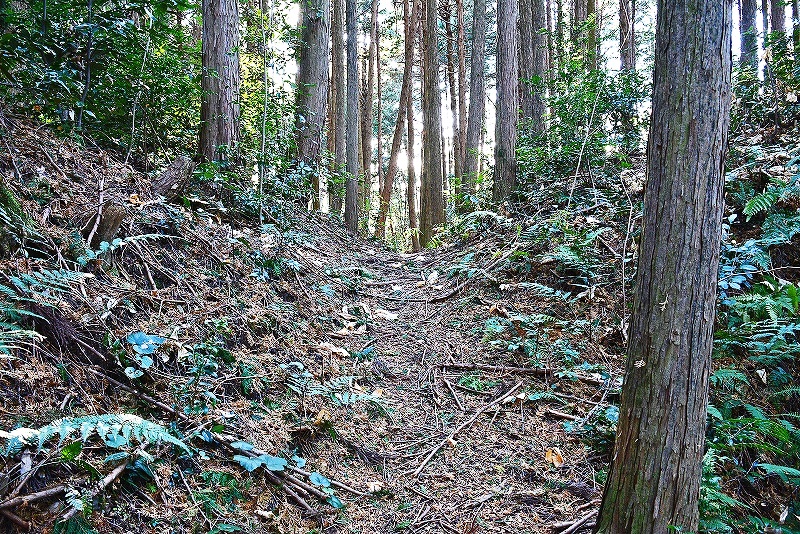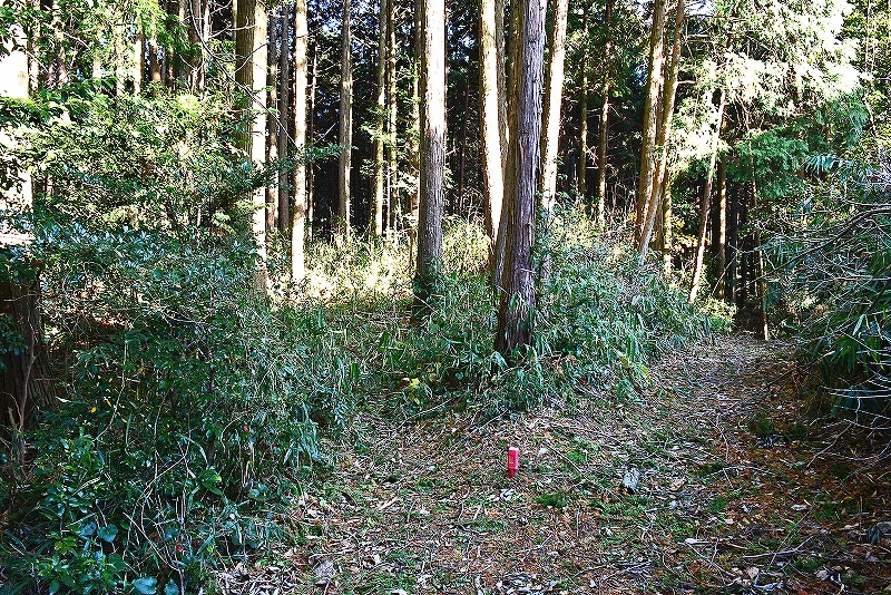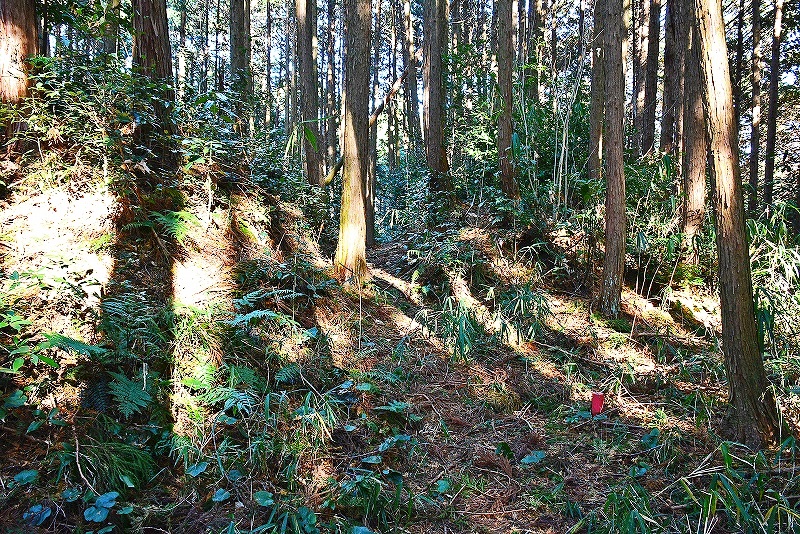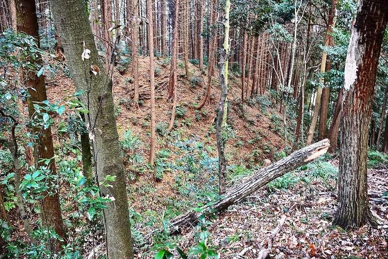 1.この細い林道から入る 2.進行方向左手に切岸が見える