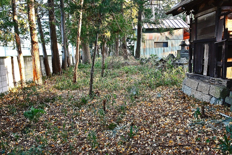 なお神社境内の西側にほんの僅かながら土塁の痕跡のように見えなくもない盛土跡が所在しているが、堀跡であったと推定される道路と野間にはブロック塀が設置されていることもあり、後世における神社の普請などに伴うものである可能性も想定され判断に迷う。