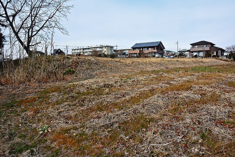 北側から撮影したもので、画像の右側の少し高い部分が主郭で、左側の低い部分が副郭(東郭)に相当するものと思われるのだが、南辺部の一部を除けば堀跡らしい形跡はほぼ失われているように感じた。
