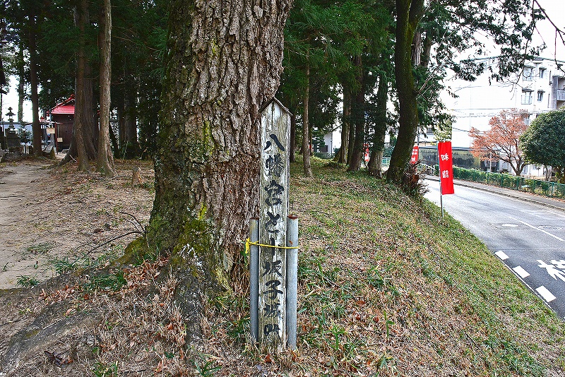 さらに市道を南下していくと八幡神社境内へと登る階段があり、登りきった所には古びた木製の城跡標柱が所在していた。