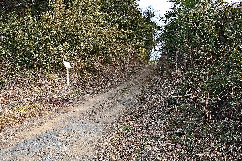 主郭とその南に続く城域を分ける堀切状地形の麓には小さな解説版が設置されていた。