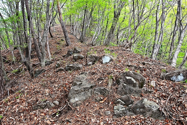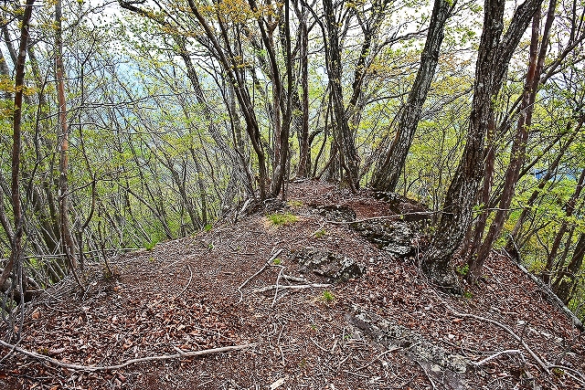 薬師岳からは北東方向に派生している尾根筋を辿れば理屈の上では直線にして約1.5kmほどで城跡付近に到達するはずです。