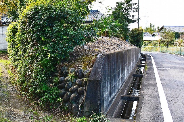 隣接する公道部分の拡張などにより道路沿いの部分はコンクリートに覆われているものの、高さ2m、長さ15mほどの土塁状の地形であった。