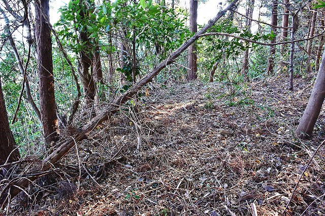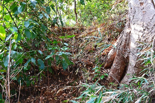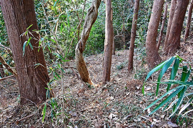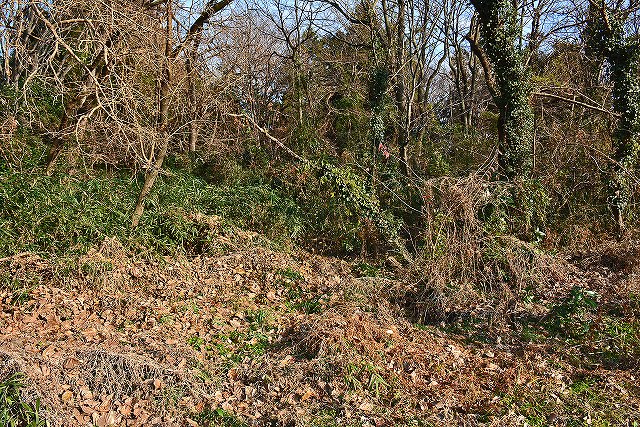 このため無闇に山林部分に突入した訳ではなく、北側の崖線部に近い方面から切岸の斜面を滑り落ちないように注意しつつ西側の堀跡へと突入した。