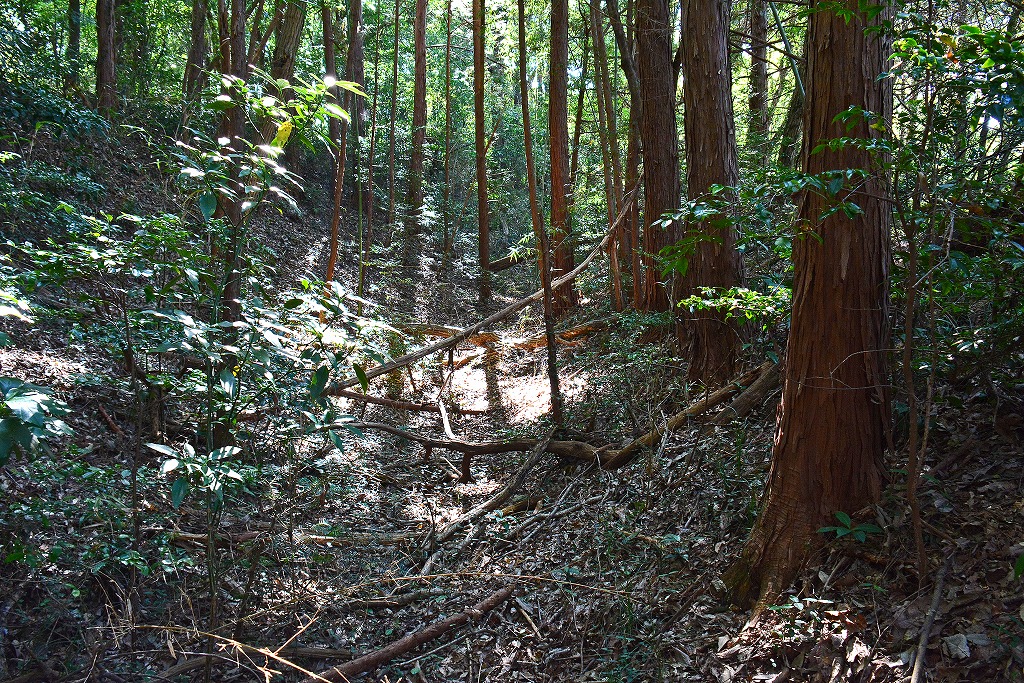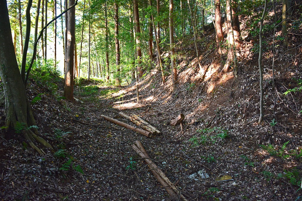 堀の深さは現状でも切岸としての高さが6mを超えるような個所も見受けられ、繁茂する木々に視界を遮られつつも城跡遺構の素晴らしさに浸ることができた。