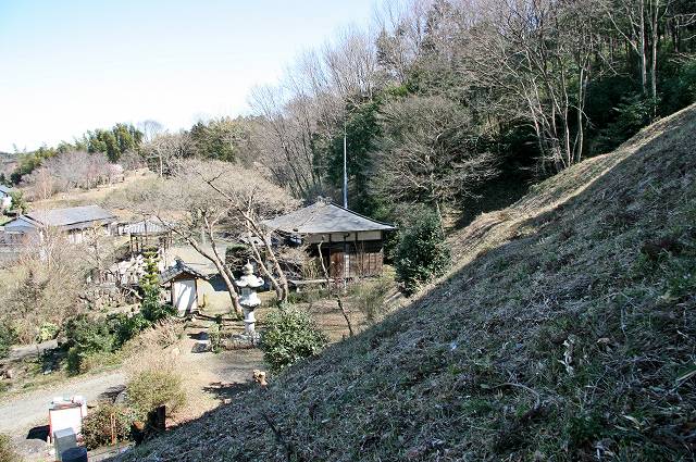 東側の杉木立の標高164m(比高差約30mほど)の小山の東側斜面には古い五輪塔を祀る塚とともに切岸状の地形が3ヶ所以上確認されます。