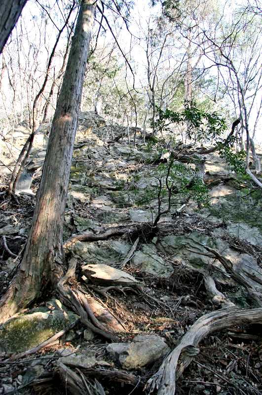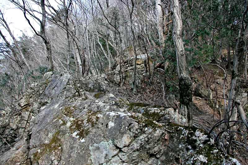 ふと目の前に広がる尾根筋の急坂を見上げると、右手前方の疎林に何やら切り立った巨大な岩塊が見え隠れ。