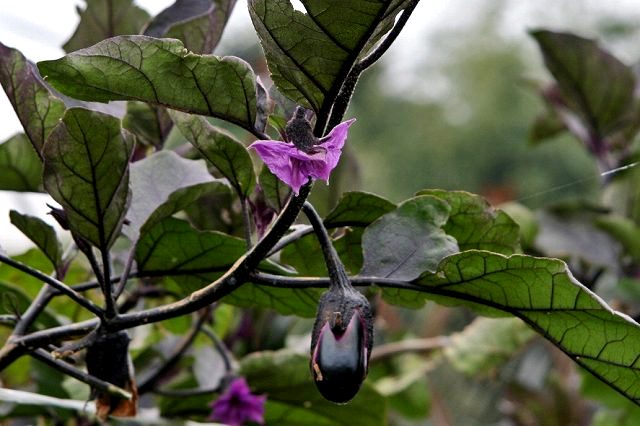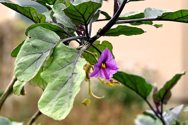 ナスの花は概して下を向いて咲くので何時も写真のアングルに困惑するのであります。