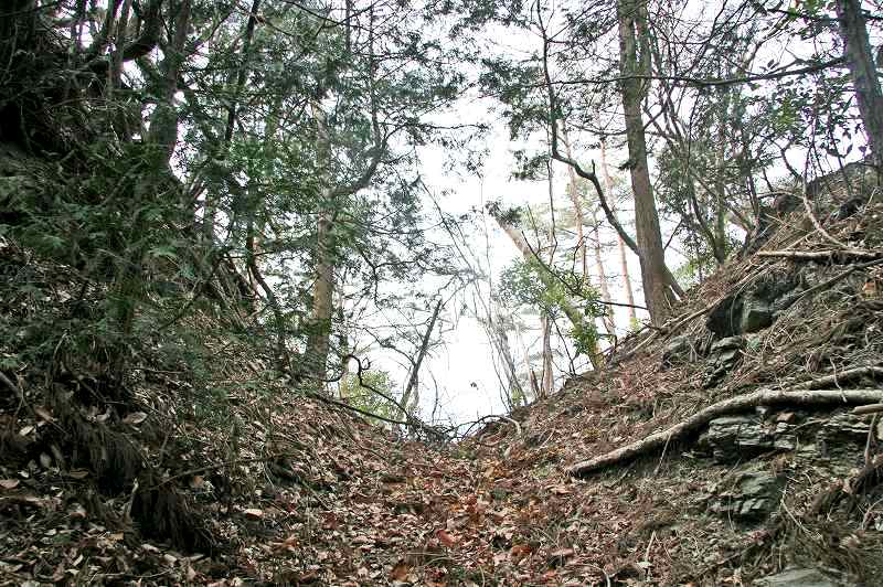 主郭側の堀切との比高差は6m近くで60度ほどの傾斜があることから直接這い上がることは困難。