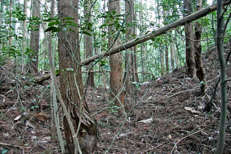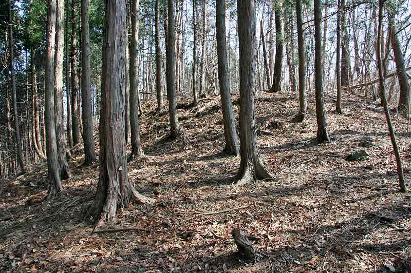 尾根筋の東側には人工的に削平された形跡のある平場が所在。