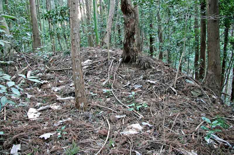 加えて西側部分には高さ1m、長さ5mほどの堀上土塁状の地形も確認。