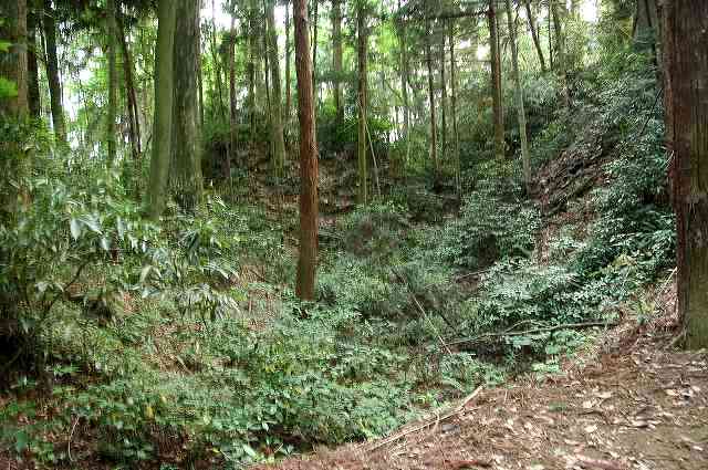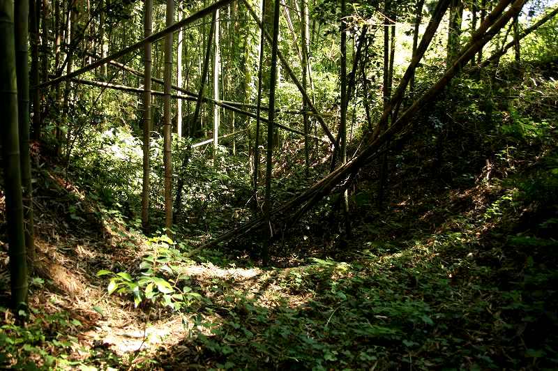 比高差20m足らずの小丘陵ということもあり、この際足回りのことは気にせずに薮蚊・蜘蛛の巣を払いつつ竹木が叢生する空堀跡を前進。