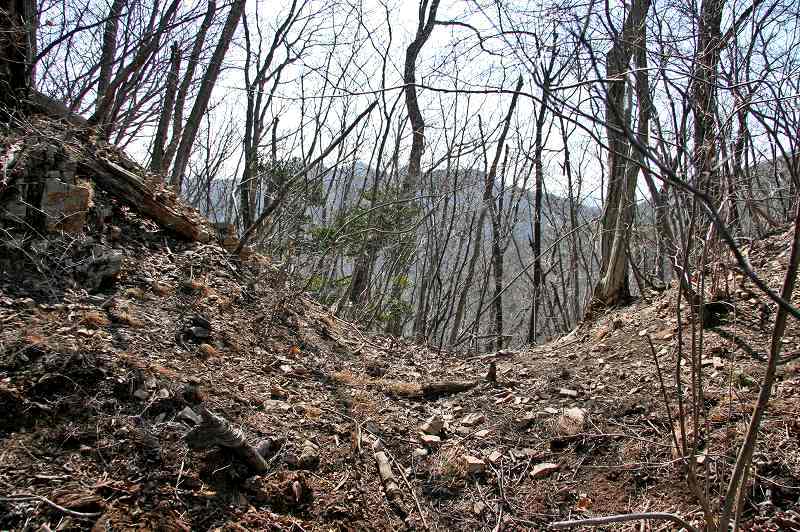 鳩ノ峰城南西側の痩岩尾根下りは樹木も少なく思いのほかの急降下。