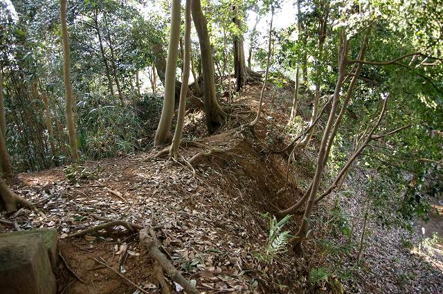 南と東側を急斜面で囲まれ、西側には堀底道、北側が件の土塁跡。