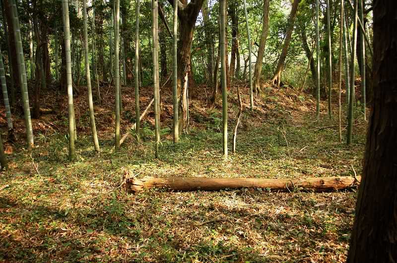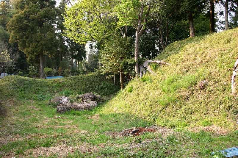 神社境内となっている郭部分と部分的ながらも良好な土塁・空堀が残存する遺構。