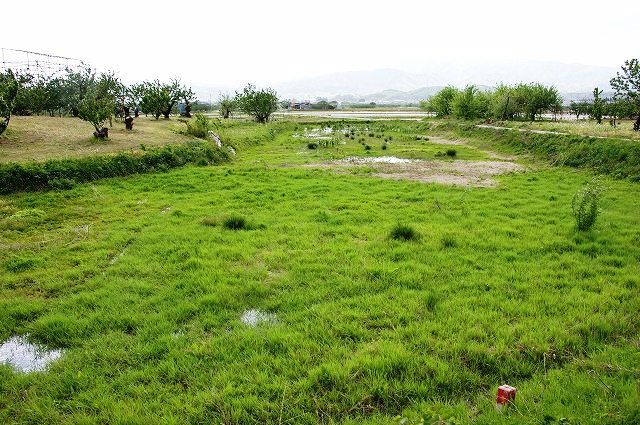 案の定、北辺の堀跡(現況は水田、ただし減反政策のため未耕作の模様)の撮影中に突然の10m前後の強風とともに本降りに。