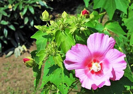 下の「フヨウ」は川島町の「美尾屋十郎廣徳館跡」に咲いていたもので、多年草のアメリカフヨウとは異なり一応は木の仲間ですが、寒冷地では冬季には地上部が枯れて地下の根だけが越冬するようです。