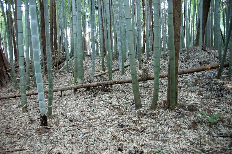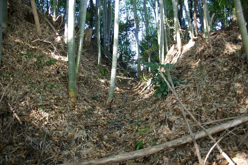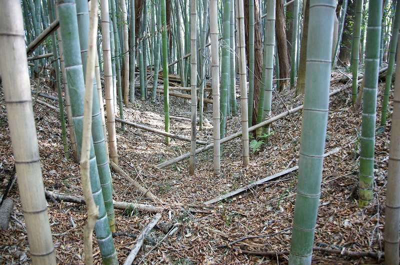 鬱蒼とした孟宗竹の林の中に方形の土塁とこれを取り巻いていたと推定される外郭土塁が現存しています。