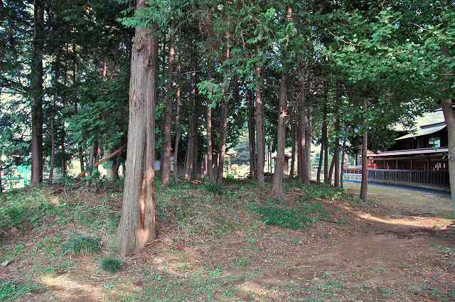 しいていえば神社に向かって右側に僅かばかりの地面の盛り上がりと、左奥に雨水の流路のような浅い溝が遺されているものの、中世城館の遺構に結びつけるのにはやや強引な印象。